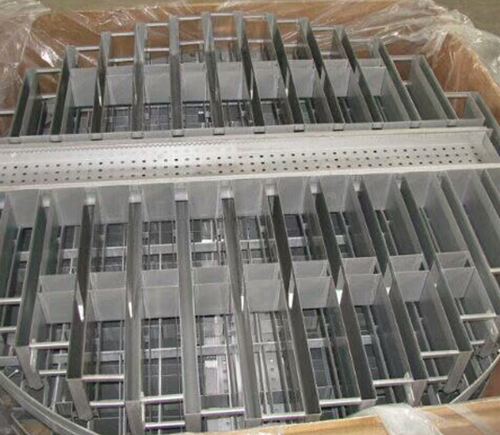 實現(xiàn)傾斜板對全截面的覆蓋,能夠?qū)σ后w收集時提升收集效率,這是柵板式支承-收集-再分布器的最Z大優(yōu)點,但是對于上升氣流的干擾以及高度的增加,會導(dǎo)致其性能受到一定程度的影響。因此,應(yīng)該采用合理的方式對柵板式支承-收集-再分布器進行改進。柵板支承絲網(wǎng)填料的過程中,液體受到上升氣流的影響,會通過塔壁四周流下。這是由于在網(wǎng)片中存在一定程度的毛細(xì)作用,加上上升氣流的上舉力作用,導(dǎo)致液體下落有在困難。為了有效對液體進行收集,需要采取合理的導(dǎo)流措施。為了便于液體分散落入分布槽中,可以將柵板下緣設(shè)計為鋸齒狀。液體沿內(nèi)壁流下后通過集液環(huán)由環(huán)形槽收集。多孔型和溢流型柵板式支承-收集-再分布器的設(shè)計,能夠分別在小流量和大流量操作中提升工作效率。